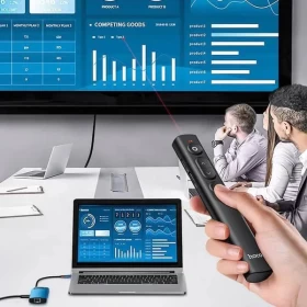 مؤشر الليزر: يسمح لك مؤشر الليزر المدمج بتوجيه الأشياء بوضوح على الشاشة حتى يفهمها الجمهور بشكل أفضل.