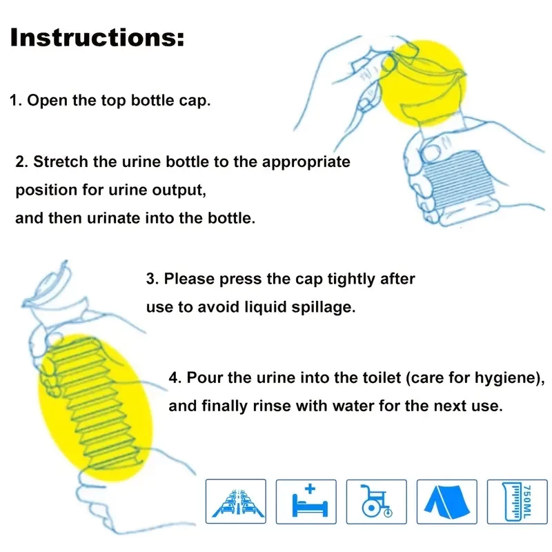 كن مستعدًا لأي طارئ مع قمع التبول الطارئ بسعة 750مل 💧🚗 – حل صحي ومحمول ومتين لمواقف الطوارئ أثناء السفر، التخييم، الرحلات البرية أو أي وقت لا يتوفر فيه حمام. مصمم ليكون مناسبًا للرجال والنساء والأطفال، يتمدد عند الاستخدام ويطوى للتخزين بسهولة، ليكون رفيقك الأمثل في كل رحلة.