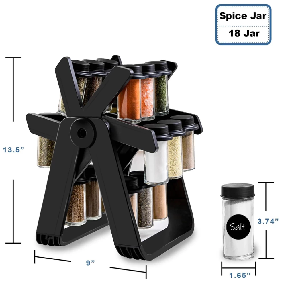Our spice rack hold 18pcs glass spice jars, which are made of food-grade glass. The revolving spice storage rack is made of heavy duty ABS, which is anti-rust and more durable and stable. Spins well and looks nice