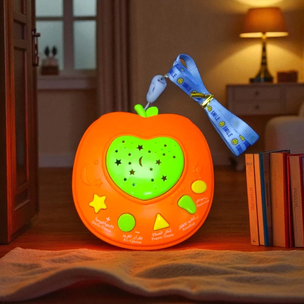 🍎 Apple Shape Learning Holy Quran Machine with LED Light Projector – Orange