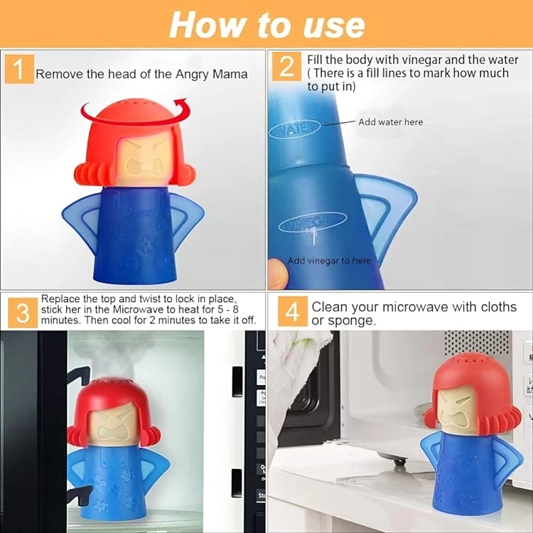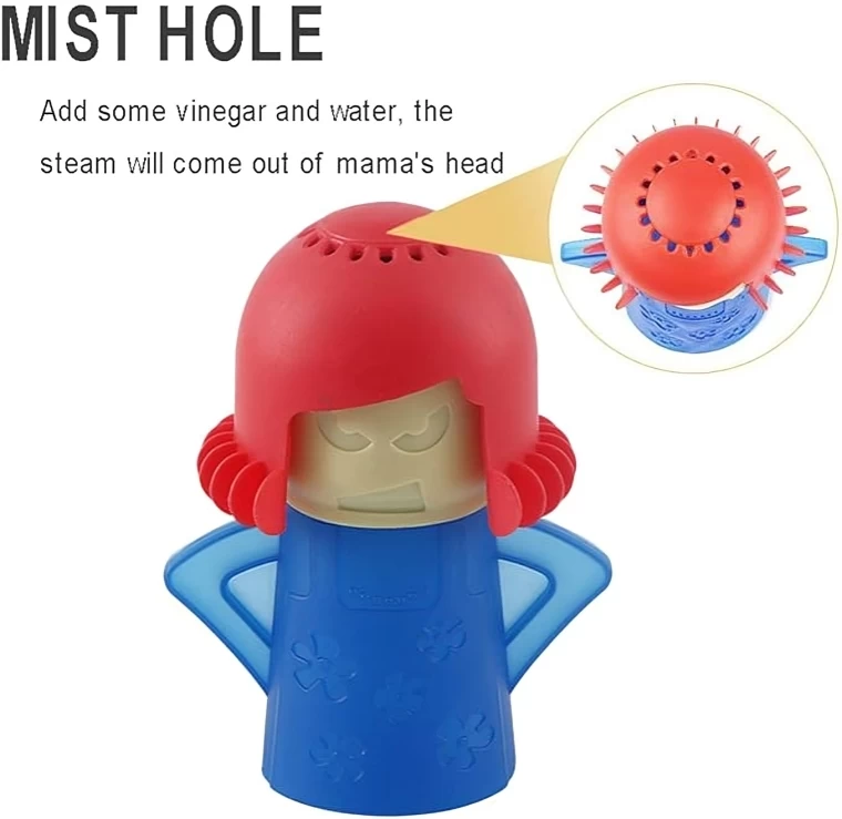 • There are some holes on the angry mama's head, let the steam comes out of mama's head to softens microwave dirt and stains for easier and thoroughly cleaning, hands-free for you to do other housework